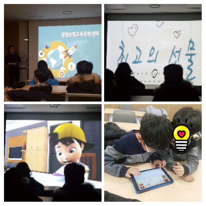 동영상 시청하고 생명보험에 관한 간략한 설명과 이름표 배부, 팀구성, 태블릿PC 팀별로 받은 후, 팀명, 팀원사진촬영, 학교 학년 등... 입력하여 체험준비하기