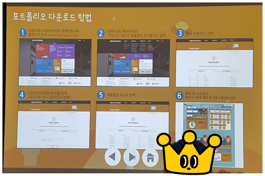 요건 일주일쯤 뒤에 생명보험교육문화센터 사이트에 올려주신다고 개별적으로 출력해서 방학숙제로 제출해도 좋을꺼라는 팁을 주셨어요~ ㅎㅎ