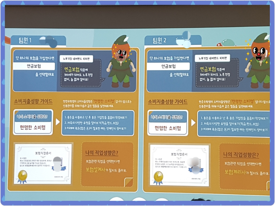 보험의 기본원리, 위험대비하기, 직업체험하기까지 등을 팀별로 체험하고 수행하도록 하였습니다~